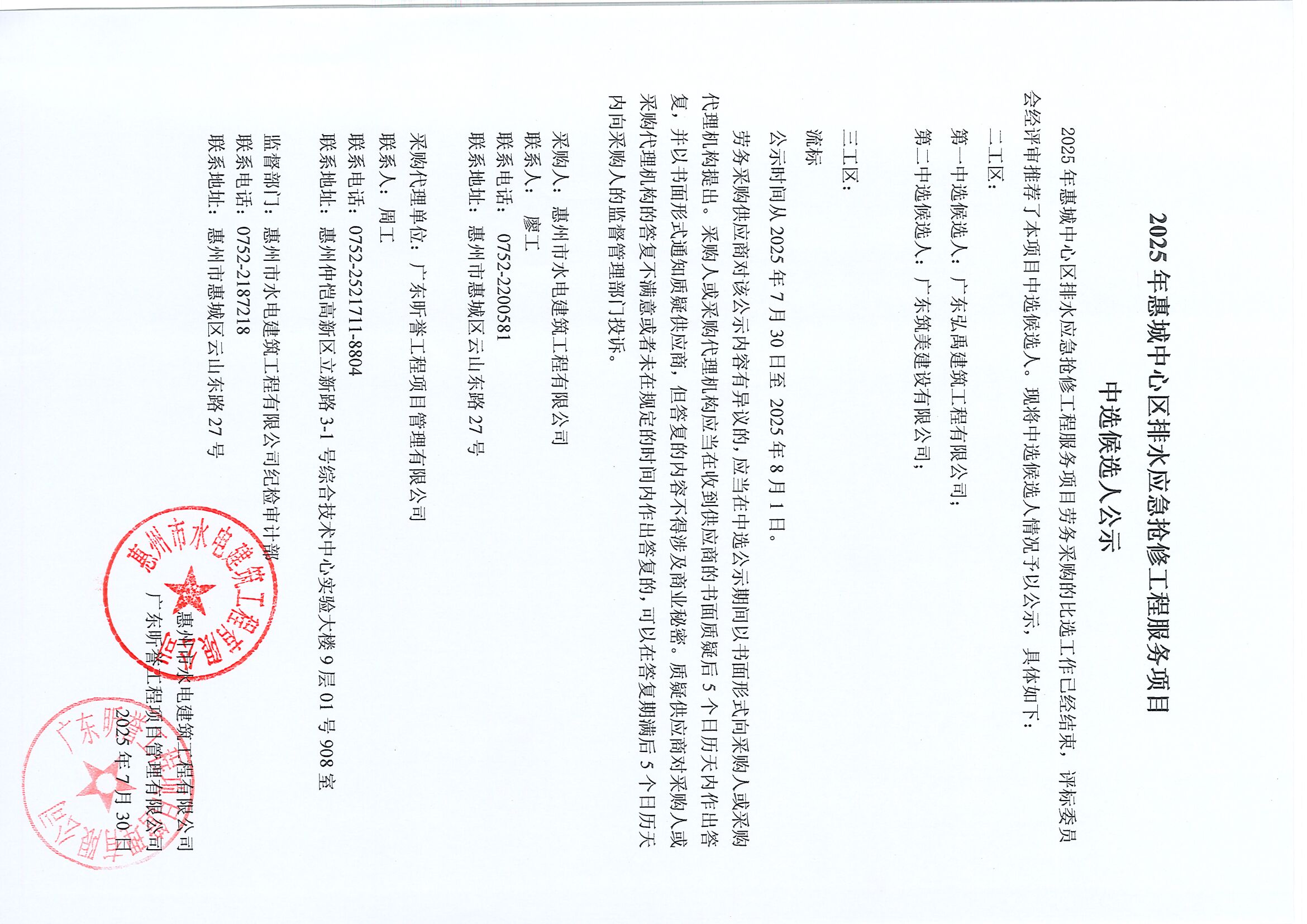 2025年惠城中心區(qū)排水應急搶修工程服務項目中選候選人公示
