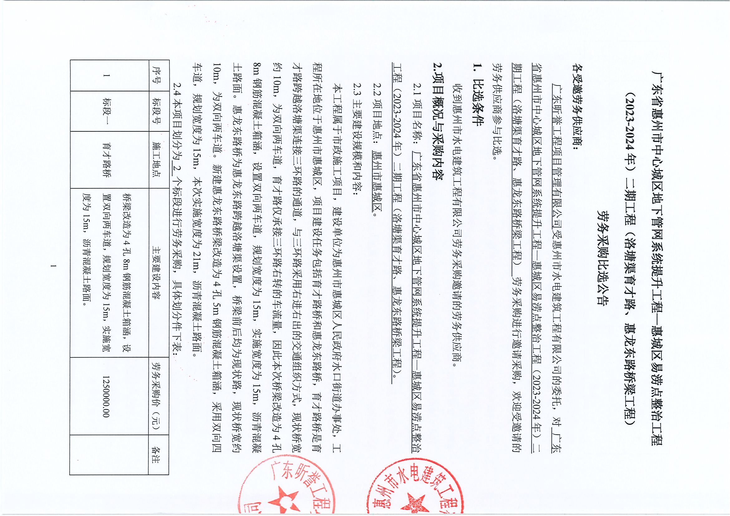 廣東省惠州市中心城區(qū)地下管網(wǎng)系統(tǒng)提升工程—惠城區(qū)易澇點整治工程(2023-2024年)二期工程(洛塘渠育才路、惠龍東路橋梁工程) 勞務(wù)采購比選公告