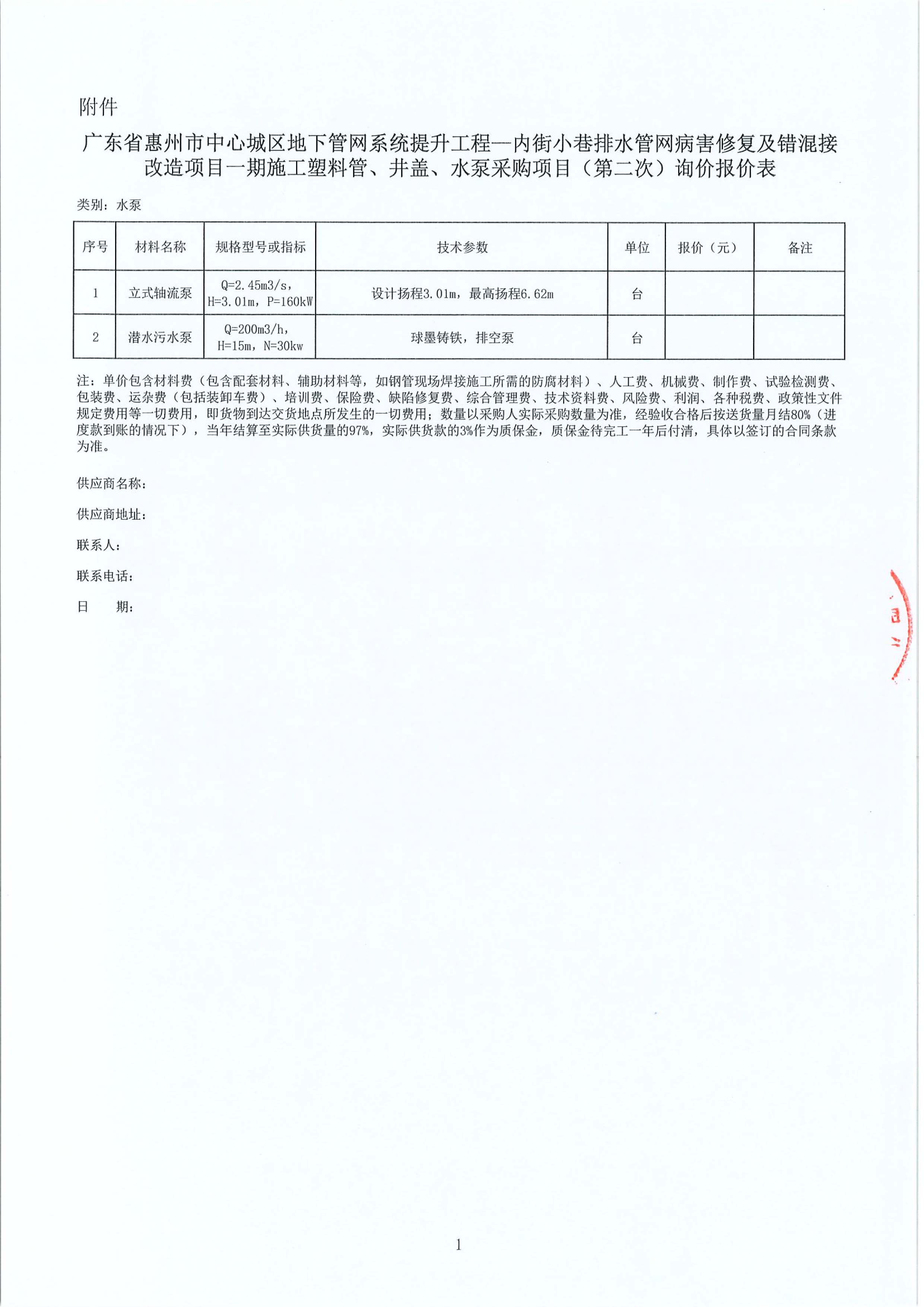 廣東省惠州市中心城區(qū)地下管網(wǎng)系統(tǒng)提升工程—內街小巷排水管網(wǎng)病害修復及錯混接改造項目一期施工塑料管、井蓋、水泵采購項目(第二次)詢價公告附件: