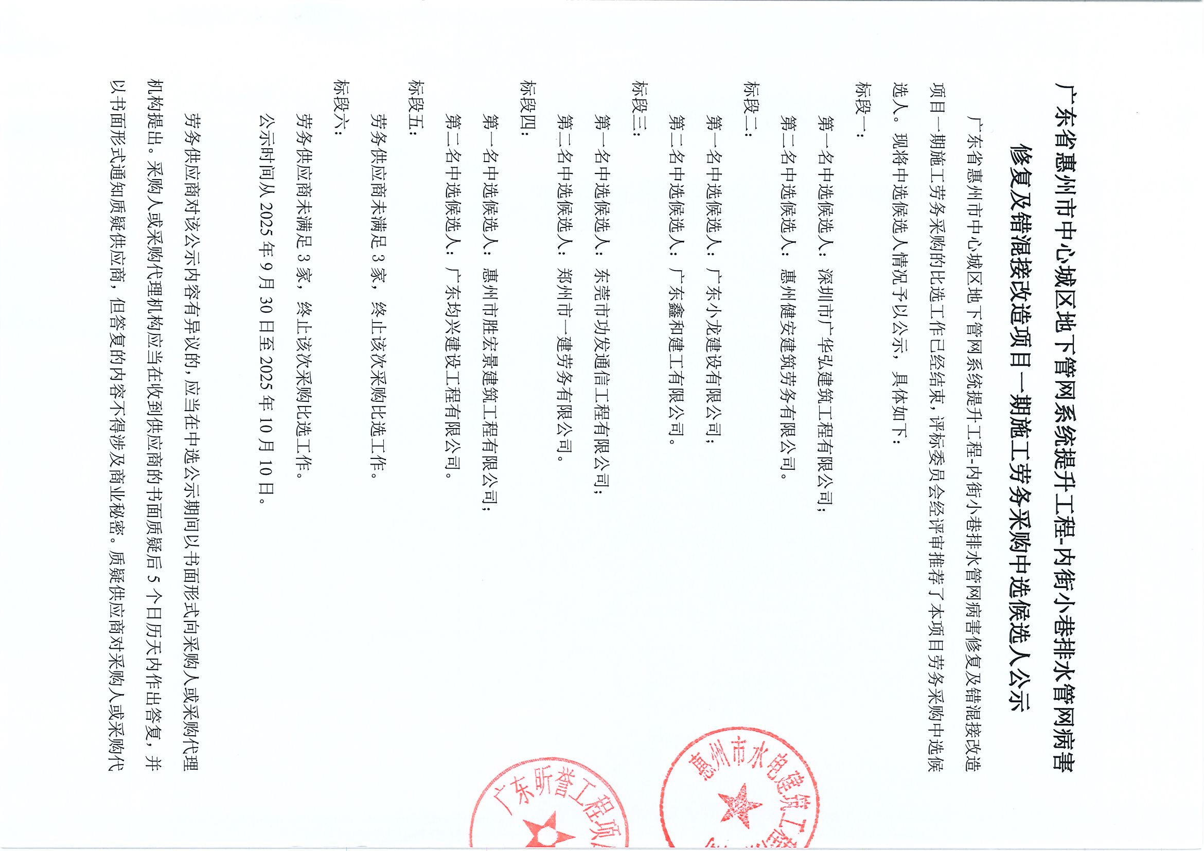 廣東省惠州市中心城區(qū)地下管網(wǎng)系統(tǒng)提升工程-內(nèi)街小巷排水管網(wǎng)病害修復(fù)及錯混接改造項目一期施工勞務(wù)采購中選候選人公示