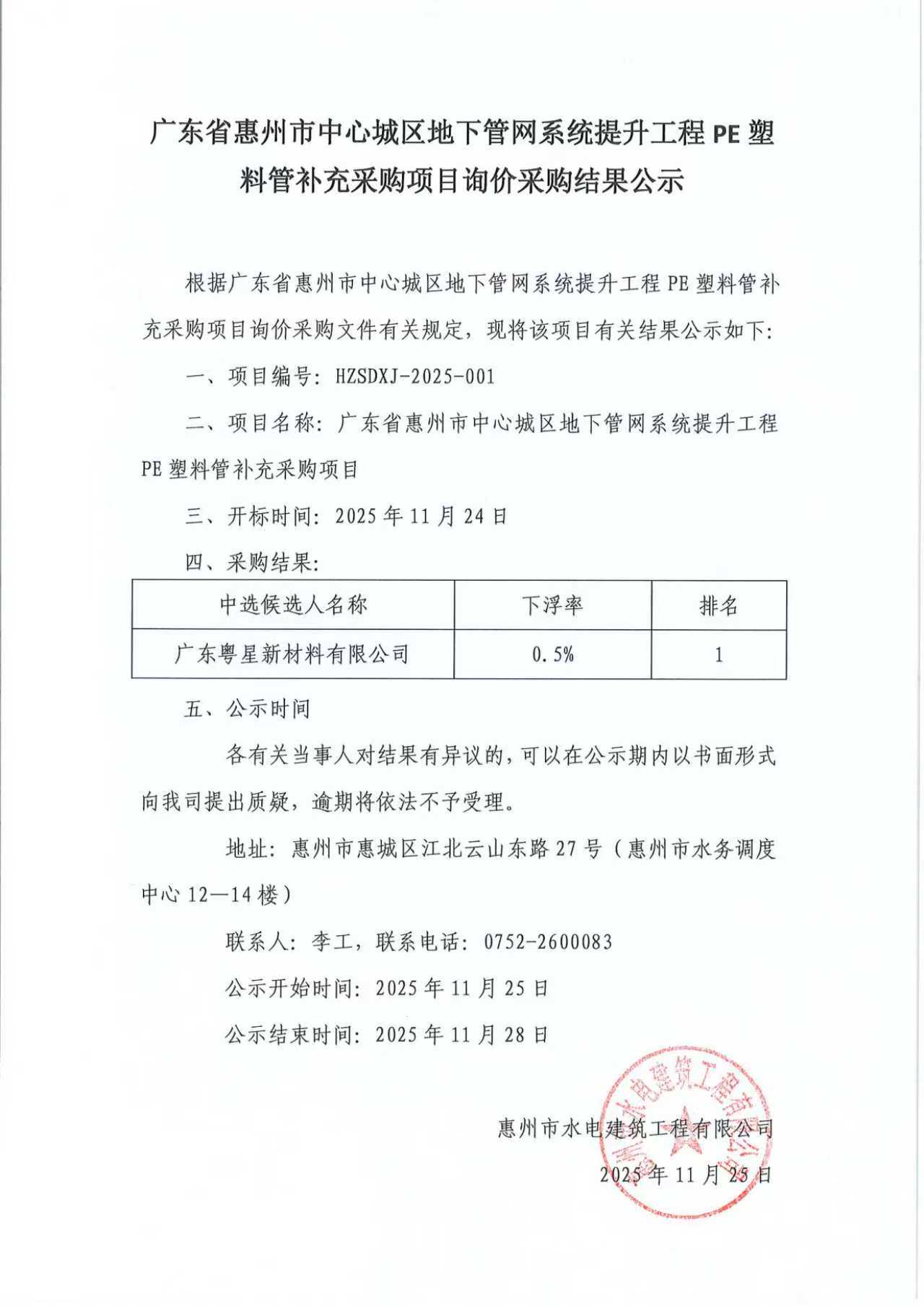 廣東省惠州市中心城區(qū)地下管網(wǎng)系統(tǒng)提升工程PE塑料管補充采購項目詢價采購結果公示