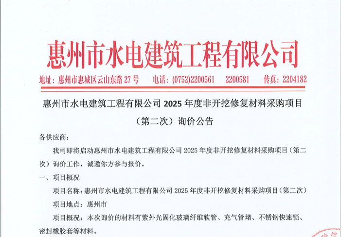 惠州市水電建筑工程有限公司2025年度非開挖修復(fù)材料采購(gòu)項(xiàng)目(第二次)詢價(jià)公告......