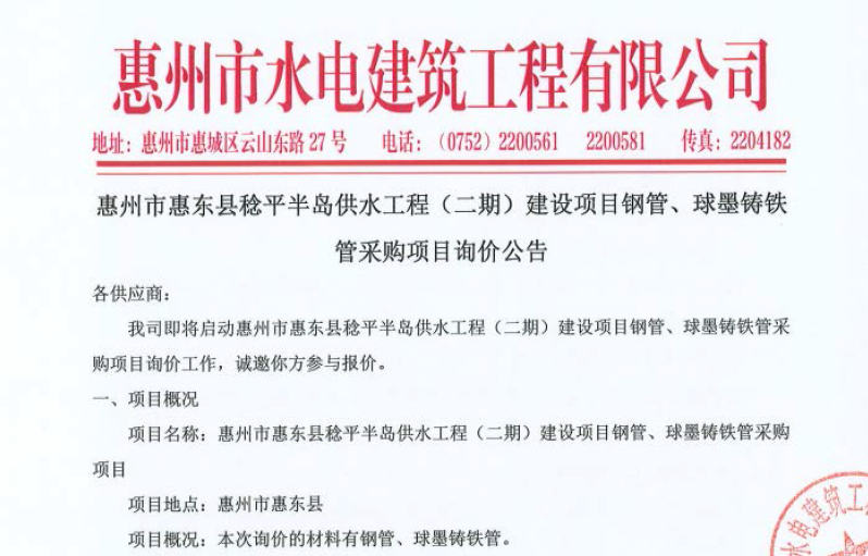 惠州市惠東縣稔平半島供水工程(二期)建設(shè)項(xiàng)目鋼管、球墨鑄鐵管采購(gòu)項(xiàng)目詢價(jià)公告......